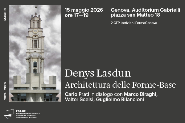 Venerdì 15 maggio 2026 dalle 17.00 alle19.00 l’Auditorium Gabrielli in piazza San Matteo 18,la conferenza dedicata alla figura dell’architetto britannico Denys Lasdun. Per l’occasione, Carlo Prati, autore della recente pubblicazione Denys Lasdun. Architettura delle Forme-Base (Edizioni Pendragon, aprile 2026) dialogherà con Marco Biraghi, Valter Scelsi e Guglielmo Bilancioni.