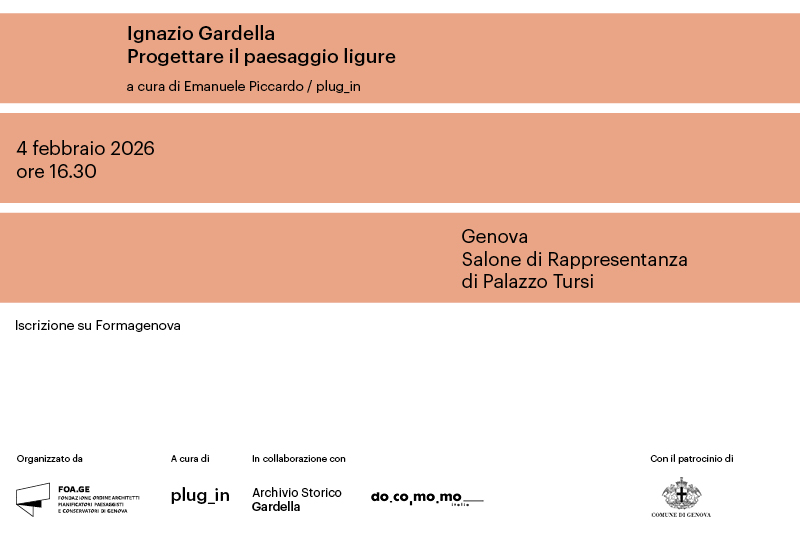 Mercoledì 4 febbraio 2026, alle ore 16:30, il Salone di Rappresentanza di Palazzo Tursi accoglierà il convegno “Ignazio Gardella: progettare il paesaggio ligure” a cura di Emanuele Piccardo/plug_in in collaborazione con la Fondazione Ordine Architetti di Genova. L’evento, patrocinato dal Comune di Genova, dall’Archivio Storico Gardella e dall’associazione Docomomo Italia è in fase di accreditamento presso l’OAPPC.