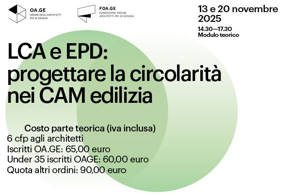 Costo parte teorica (iva inclusa) 6 cfp agli architetti: Iscritti OA.GE: 65,00 €; Under 35 iscritti OAGE: 60,00 €; Quota altri ordini: 90,00 €.